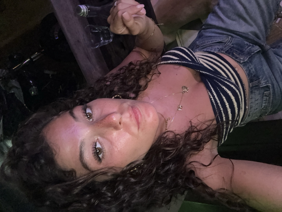 The image depicts a young adult female in a dimly lit environment in Uluwatu, Indonesia. She has long, dark, curly hair, light brown eyes, and visible freckles on her nose and cheeks. Her attire consists of a dark blue and white striped strapless top and light-wash blue jeans. She is adorned with gold-colored hoop earrings, multiple layered gold-colored necklaces (one featuring "PO" and a heart charm), and a ring on her left ring finger. A navel piercing is also visible. She is holding a clear glass bottle with a silver cap in her left hand. An empty clear glass sits on a dark wooden surface positioned to her right. The background is predominantly dark, with a partially visible dark, reflective object in the upper right quadrant, consistent with components of a parked motorcycle. The subject is looking directly into the camera, capturing a close-up selfie.