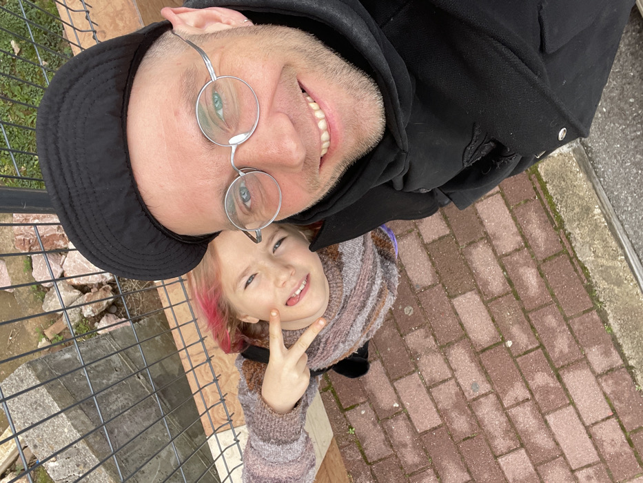 An overhead shot shows a smiling man and a young girl posing together. The man has fair skin, a bald head, round glasses, and a black hooded jacket. The girl has fair skin, blonde hair with pink streaks, and wears a multicolored sweater. She sticks out her tongue and makes a peace sign. They stand on a red brick walkway near a dark metal fence and a concrete ledge strewn with rubble.