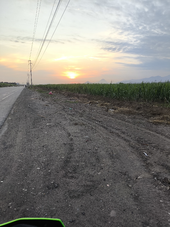 This image depicts a rural scene in Laredo, Peru, during either sunrise or sunset. A two-lane asphalt road extends into the distance on the left side of the frame, bordered by an unpaved dirt and gravel shoulder. The shoulder exhibits visible tire tracks and scattered refuse, including a pink plastic bag and a white plastic bag. A series of utility poles supporting multiple overhead power lines parallels the road. To the right of the shoulder, an extensive agricultural field cultivated with rows of tall green crops, consistent with sugarcane or corn, stretches horizontally across the midground. The distant horizon features hazy blue-gray mountains. The sky is partially cloudy, dominated by a prominent orange-yellow sun positioned low on the horizon. A small, dark, unidentifiable figure, possibly a pedestrian, is faintly visible on the far roadside. A bright green, curved object, likely a vehicle component, is partially visible in the lower-left foreground.