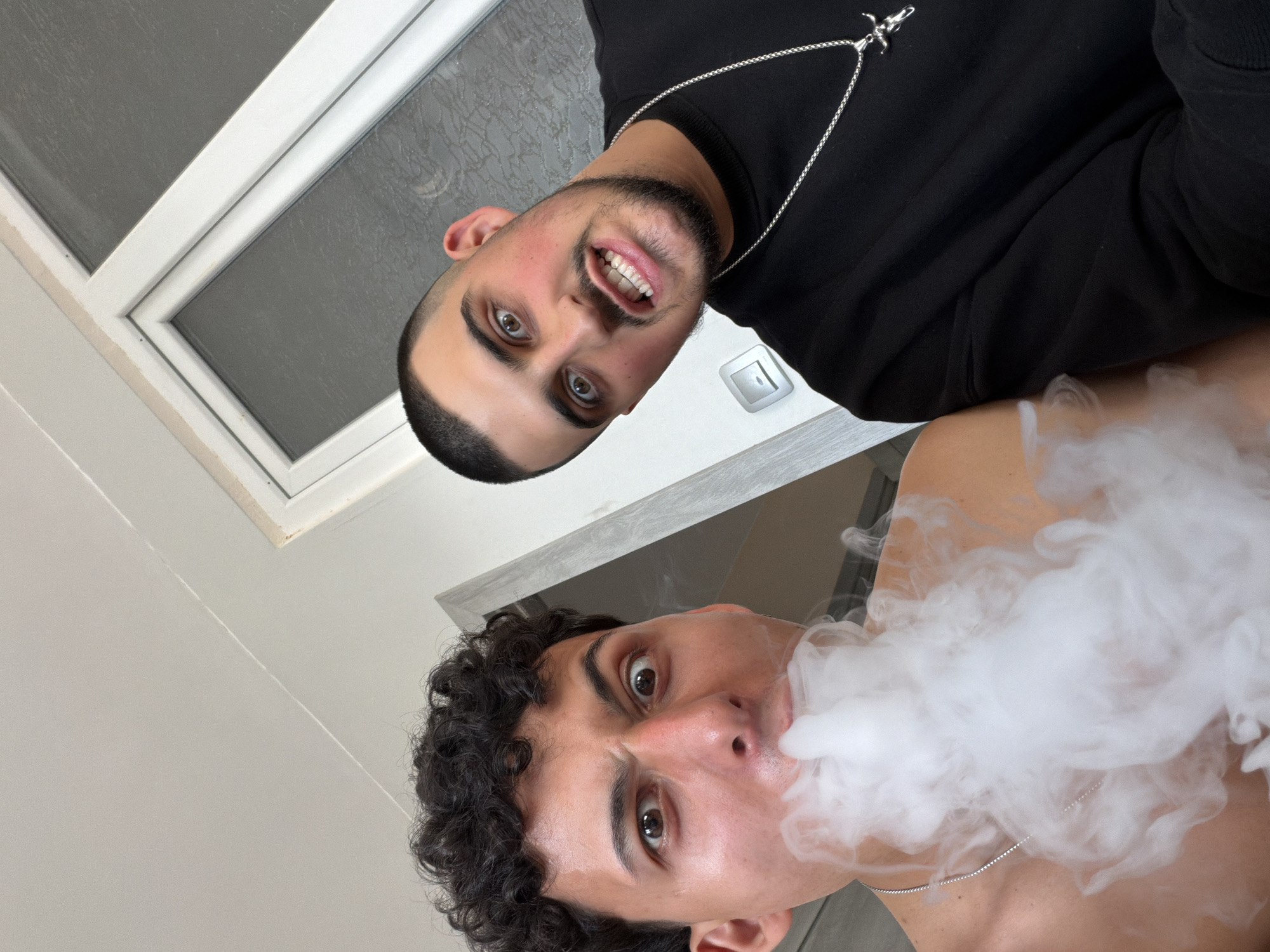This image depicts two males indoors, within the city of Varna, Bulgaria. The male positioned on the left, partially shirtless with dark curly hair, is exhaling a significant, dense cloud of white vapor from his mouth. His facial expression includes wide-open eyes and raised eyebrows. A thin silver chain is visible around his neck. The male on the right, with short dark hair and stubble, wears a black long-sleeved shirt and a silver chain necklace with a bull or ram's head pendant. He presents a wide-eyed, grimacing expression, baring his teeth, with noticeable redness on his cheeks. Both individuals are looking directly forward, toward the camera. The background consists of a plain white wall and ceiling, with a white-framed door or window, featuring obscured glass panels, partially visible on the right. A silver-colored square light switch is mounted on the white wall below the visible door/window frame.