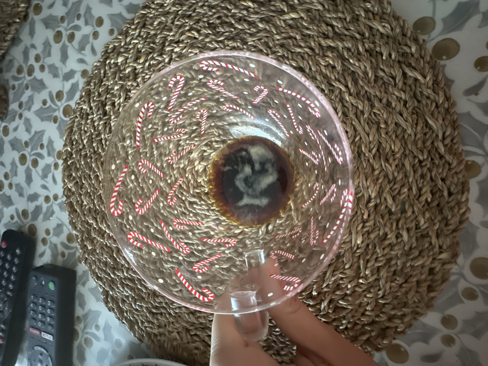 An overhead shot shows a mostly-empty coffee cup with candy cane decorations. The cup sits on a woven straw placemat, which in turn sits on a patterned tablecloth. A hand holds the cup by its handle. Two remote controls are also visible on the tablecloth. The coffee dregs at the bottom of the cup show a swirling pattern.