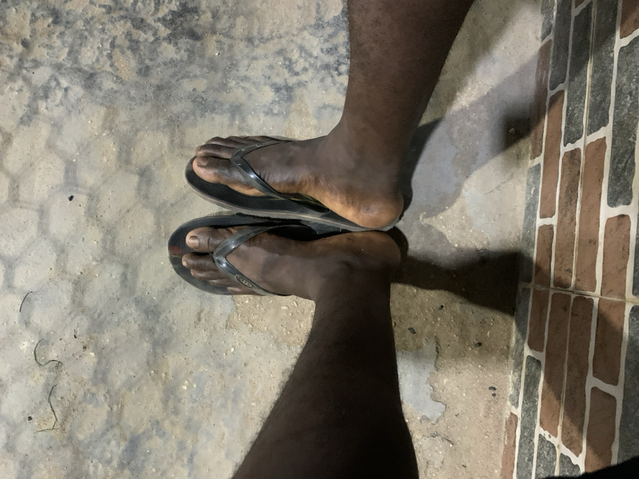 A person's bare feet wearing black flip-flops stand on a gray paved surface. The lower legs are visible, showing dark skin. A wall with vertical tiles of gray, brown, and white brick patterns is on the right. The image appears to be taken from an overhead angle. The floor is textured and slightly dirty. The lighting is somewhat dim, casting shadows near the wall.