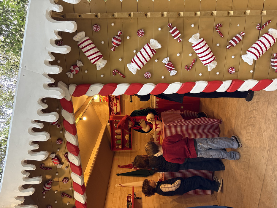The image displays a decorated wooden stall, resembling a gingerbread house, situated in Castellar del Vallès, Spain