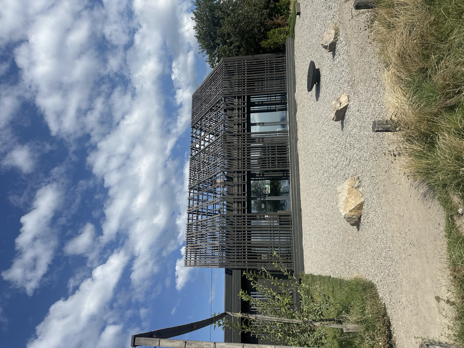 The image displays an exterior daytime view of a modern, dark-colored building situated in Vytachiv, Ukraine, under a blue sky with scattered white cumulus clouds. The building features a prominent slatted facade composed of vertical dark timbers, particularly noticeable on its front and partially extending over its gabled roofline, creating a latticed appearance. Large, reflective glass doors or windows are visible on the front elevation. A darker, solid-walled section of the building extends to the left from the slatted structure. The foreground is a landscaped area primarily covered with light-colored gravel. Within this gravel, several large, irregular light-brown rocks are placed, along with a single dark, circular object, possibly a fire pit, located to the right of the center. To the left of the gravel area, a small, leafy green tree or shrub is visible, rooted in a patch of green grass. The immediate foreground shows a dirt path merging into the gravel, bordered by dry, light-brown grass and two short, dark wooden posts. A tall, dark wooden post is partially visible on the far left of the frame. To the far right, a section of a dense green tree is present. No individuals are depicted in the scene, and no overt actions or interactions are occurring.
