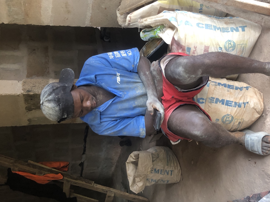 In Alor, Nigeria, a young adult male is seated on a cement bag within a construction environment