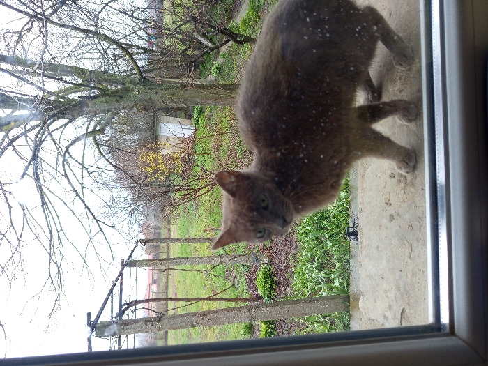 The image depicts an outdoor scene in Mokresh, Bulgaria, viewed through a window with a white frame. A domestic short-haired cat with grey-brown fur and green eyes stands on a concrete sill or ledge immediately outside the window, facing towards the viewer. Its fur is mottled with numerous small white specks, consistent with light precipitation or debris. Beyond the cat and sill, a garden or yard is visible under an overcast sky. In the midground, green grass and various shrubs and trees, some bare-branched, occupy the space. To the left, a structure composed of concrete posts and wires extends into the scene. Further back and to the right, a small, light-colored outbuilding with a white door is visible. In the distant background, structures with reddish roofs can be discerned.