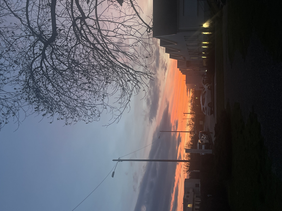 This image depicts an urban street scene in Sélestat, France, at sunset. The sky exhibits a gradient of colors, transitioning from vibrant orange and red hues at the horizon, indicative of the setting sun, to pink and pale blue overhead, with scattered dark clouds. A large, deciduous tree with bare branches is prominently silhouetted against the sky in the upper right portion of the frame. In the midground, a paved street is visible, with a white SUV parked on the right side, facing away from the viewer. Additional vehicles are discernible further down the street. Two streetlights, connected by overhead power lines, are present: one in the left-center foreground and another further down the street to the right. On the right side of the street, a row of light-colored, multi-story buildings with distinctive sawtooth-shaped roofs extends into the distance. These buildings are illuminated by multiple warm-toned exterior wall-mounted lights. On the left side of the street, a light-toned, multi-level building is partially visible. The immediate foreground consists of dark ground cover, possibly grass or gravel, and low silhouetted vegetation. No human subjects are visible, and no discernible actions or interactions are taking place.