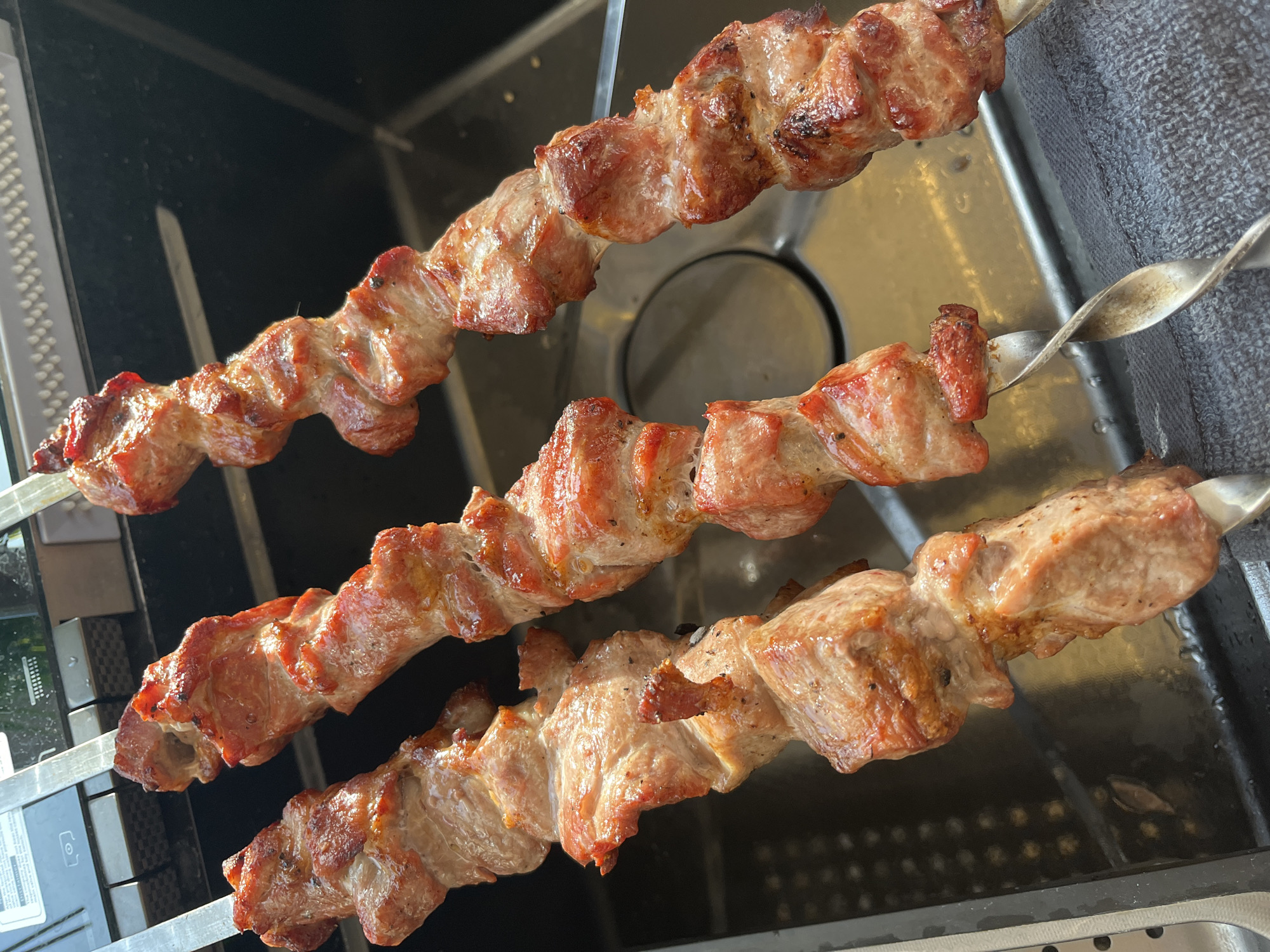 Three metal skewers, each laden with multiple pieces of cooked meat, are depicted resting horizontally across a metallic kitchen sink