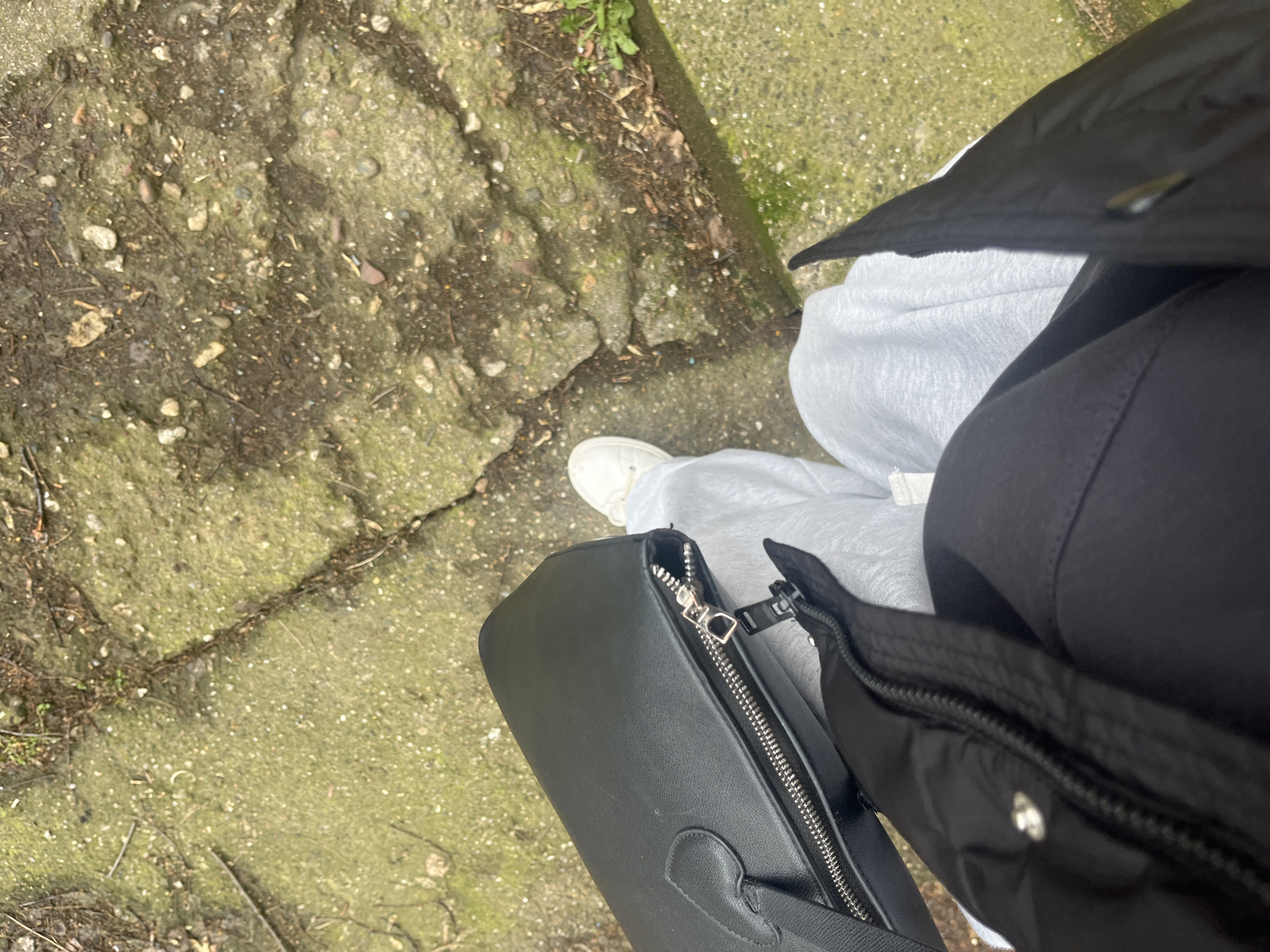 - "The photograph, taken from an overhead perspective, shows a person standing on a cracked concrete surface with a black handbag, grey sweatpants, white sneakers, a black top, and a black jacket" by FM-riJfB3, licensed under CC BY 4.0