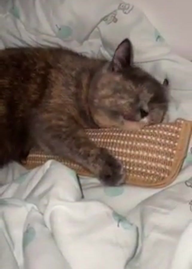 - "A tortoiseshell cat is sleeping on a patterned pillow on a bed with patterned sheets" by FM-oJoph1, licensed under CC BY 4.0