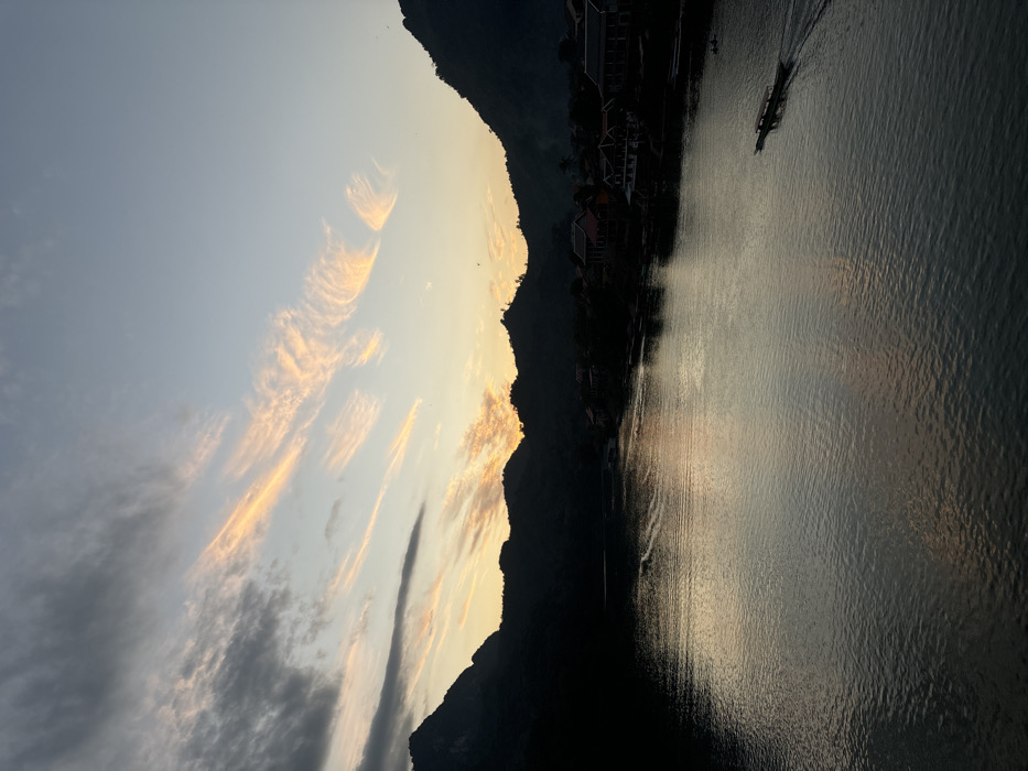 A wide-angle landscape photograph depicts a river scene at either sunrise or sunset, situated in Sophoun, Laos. The sky, occupying the upper portion, transitions from dark grey stratiform clouds on the upper left to a light blue with distinct, elongated orange and pink cirrus clouds across the mid-to-upper right, indicating low sun angle. A warm orange glow is visible along the horizon line. Dark, silhouetted mountains frame both sides of the river, with a more pronounced range on the left and a lower range backing a settlement on the right. The river, occupying the lower half, reflects the sky's colors, appearing dark with subtle ripples across its surface. A long, narrow motorized boat, equipped with a canopy, is observed traversing the river diagonally towards the lower right, producing a visible wake. A second, smaller wake is detectable further upstream on the left. Along the right bank, a cluster of buildings forms a village or settlement, predominantly silhouetted against the sky. Several additional narrow boats are moored or beached along this bank. No individuals are discernible.