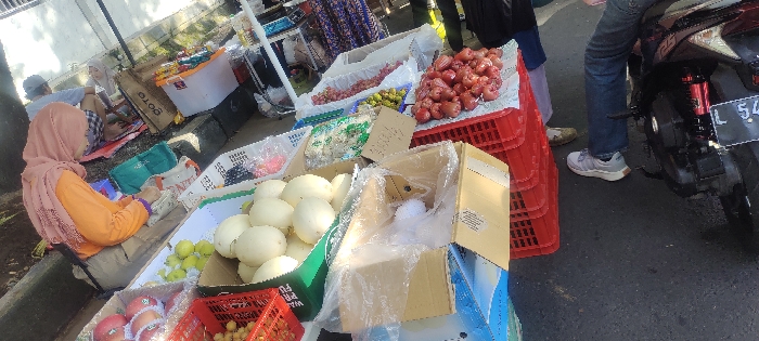 A woman wearing a headscarf sits on a chair in the shade, holding a paper bag, next to a table laden with produce, including apples, green fruit, and melon. The table is covered in a white cloth and a large cardboard box. Three red crates filled with red berries are stacked near the table. A black motorcycle with a blurred rider is parked to the right. The scene takes place in an open-air market located in Kecamatan Buduran, Indonesia (latitude: -7.443, longitude: 112.705).