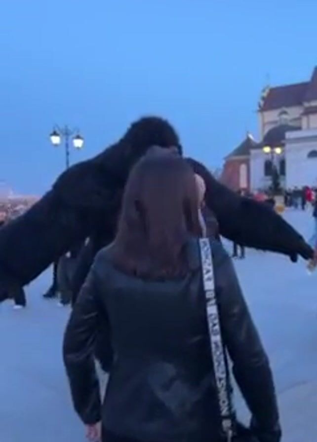 The video depicts a person in a gorilla costume interacting with people in a public setting. A woman with long dark hair, wearing a black leather jacket and black pants, stands in front of the gorilla. A man in a dark jacket and light-colored shirt stands beside the gorilla, smiling. The gorilla costume is full-bodied and appears quite realistic, with a detailed head and open mouth revealing teeth. The scene takes place on a paved plaza, and in the background are streetlights, other people, and a building with a red roof and white walls. The woman filming laughs as the gorilla hugs the man. The sky is a light blue, indicating it is either early morning or late afternoon.