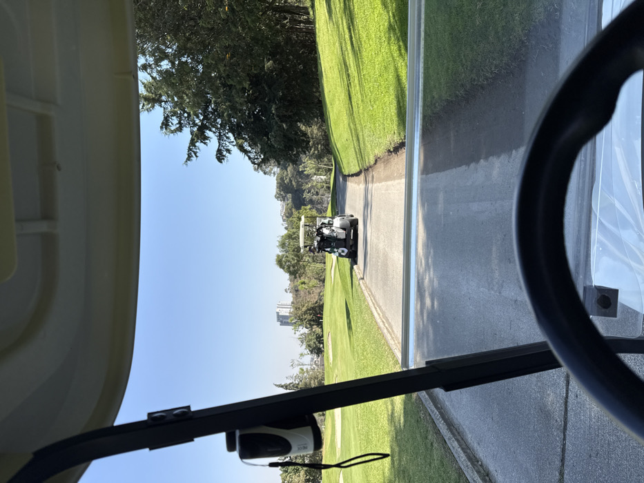 - "From inside a golf cart, a paved path stretches ahead between manicured green lawns" by FM-yN5gt2, licensed under CC BY 4.0