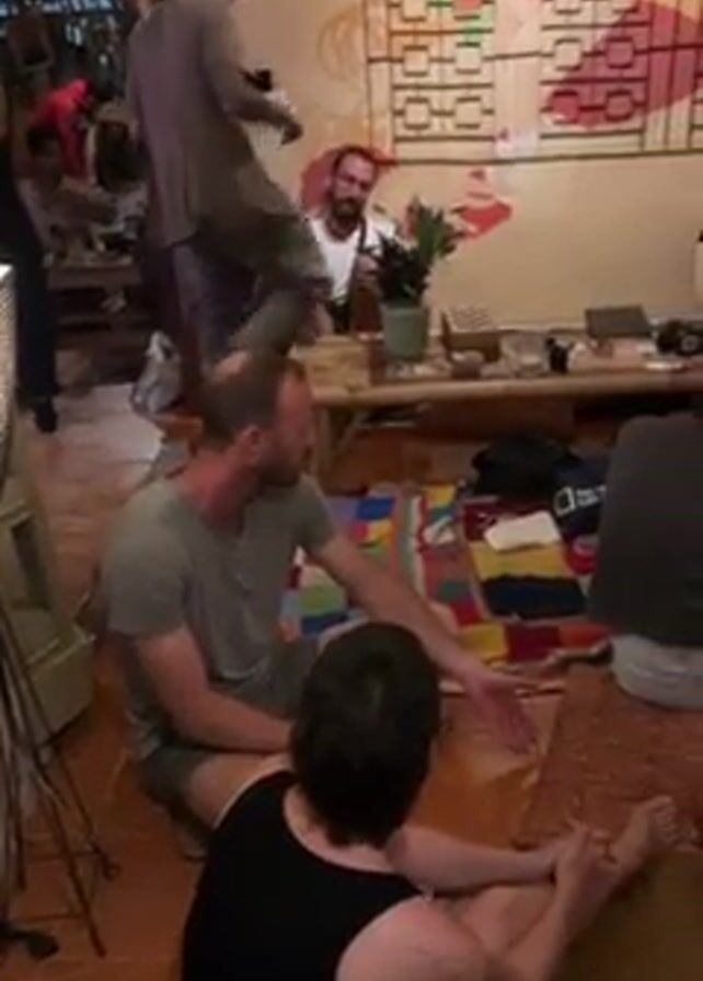 A group of nine people is gathered in a room with a low bamboo table. Some are sitting on the floor, and others are seated on a patterned rug. There is a painting or mural on the wall behind them. One man with long hair stands up and points at the table as he appears to explain something. A couple is playing Jenga on the table, while the others are looking on. A floor lamp stands to the left of the seated group, and various objects are scattered around the table, including bottles, a plant, and a camera. The floor is tiled.
