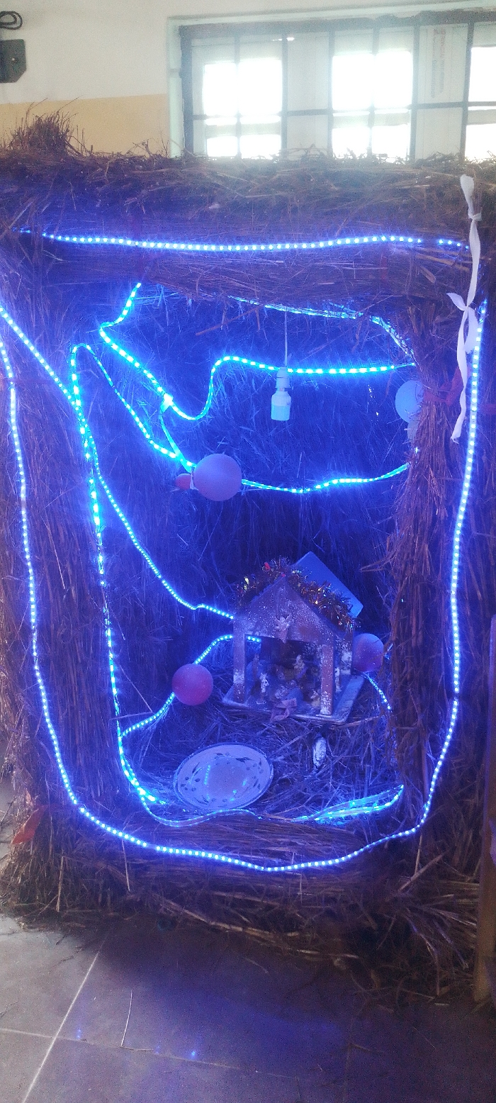 A nativity scene is encased within a rustic, hay-constructed enclosure. Blue LED string lights illuminate the scene. Inside, a small wooden structure houses the nativity figures. Decorative elements include red balls, a dangling white object, a plate, and tinsel. A white ribbon is attached to the side of the hay enclosure. The background features a window with light streaming through.