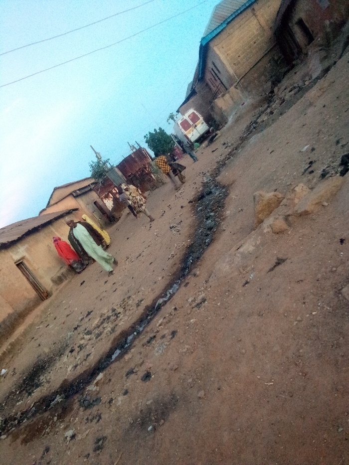 The image captures an unpaved street in Bukuru, Nigeria, under a clear, light blue sky