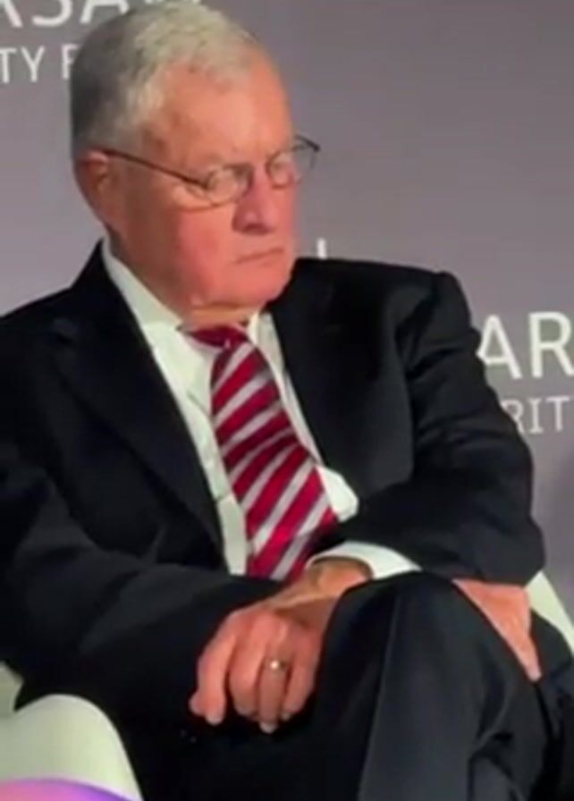 n older man sitting on a white chair. He is wearing a dark suit with a white shirt and a red and white striped tie. He has glasses on and his arms are crossed. He is looking to his right. Behind him, there is a gray wall with text that partially reads "WARSAW."