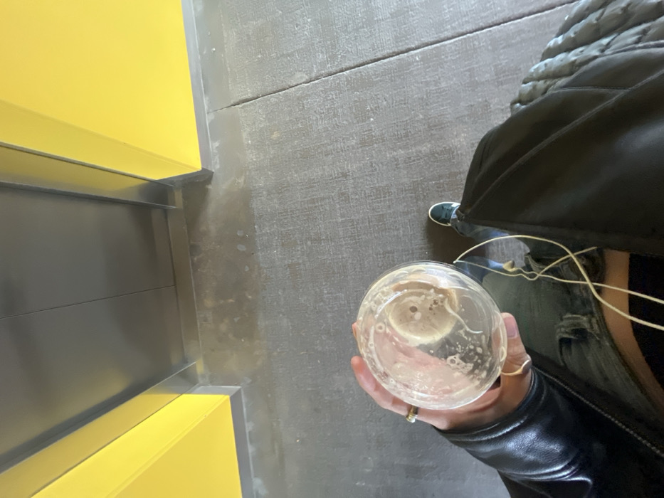 A person holds a nearly empty clear plastic cup with remnants of a foamy beige beverage. The hand holding the cup has rings on its fingers and is positioned near a black leather jacket. The background shows a concrete floor and the edge of a structure with yellow and gray paneling. A blue and white shoe is partially visible near the jacket.