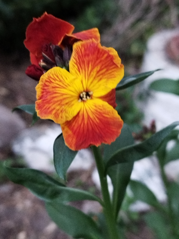 A close-up photograph taken in Sandanski, Bulgaria, features a single blooming flower positioned centrally. The flower displays four prominent petals, exhibiting a color gradient from bright yellow at its core to orange and then reddish-orange towards the periphery, with distinct radial striations. The central reproductive structures are visible, comprising dark stigmas and yellow-tipped stamens. To the upper left, a secondary flower or bud, predominantly red-orange, is partially observed. The main flower is attached to a green stem, from which multiple elongated, dark green leaves emerge. The background is significantly blurred due to shallow depth of field, revealing indistinct shapes consistent with outdoor elements, including grey-brown earth or stone, and areas of dark green vegetation. No human subjects or interactions are depicted.