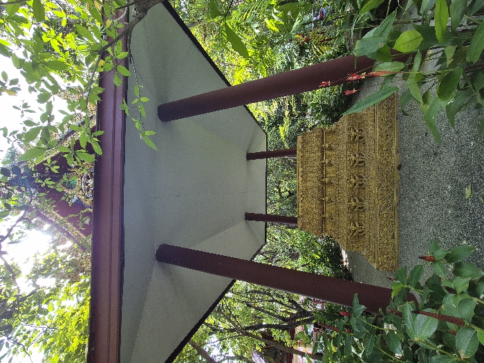 A unique angle captures a structure with a low, peaked roof supported by cylindrical columns. The roof's underside is white, while the exterior is framed in red. A golden, intricately carved facade stands next to it, affixed to a gray, weathered wall. Green foliage surrounds the structure, adding a vibrant, natural element to the scene. The lighting is dappled, creating an interplay of light and shadow.
