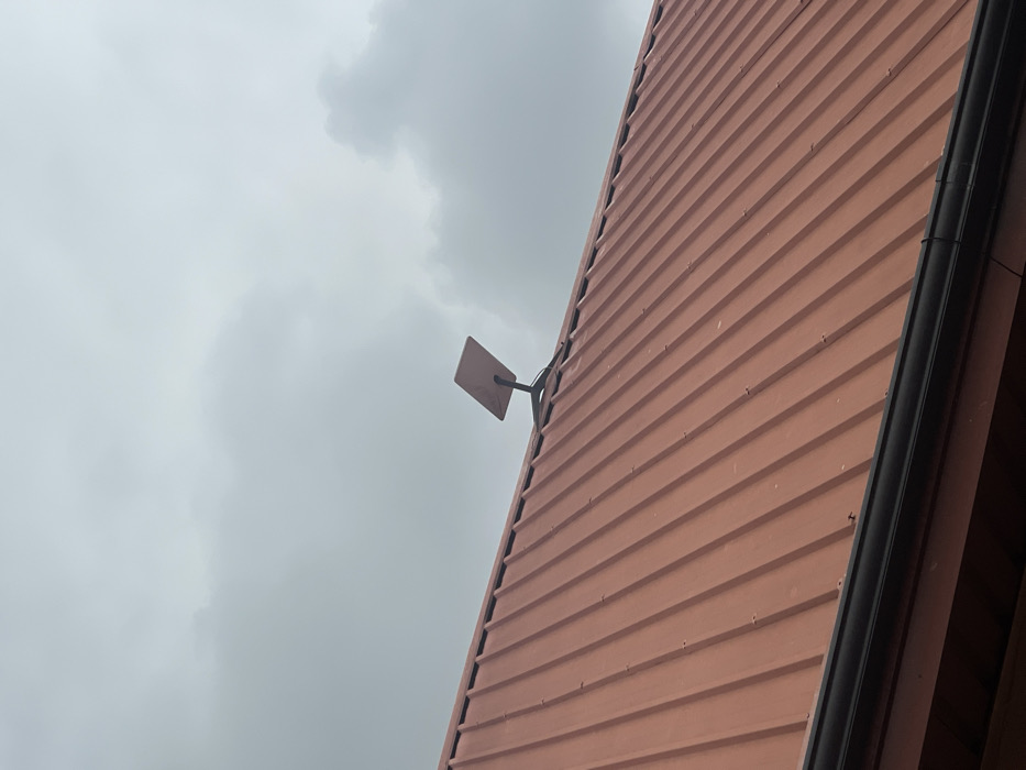 - "The image displays a flat, rectangular satellite internet dish, consistent with a Starlink Gen 2 model, centrally positioned on the upper slope of a reddish-brown corrugated metal roof" by FM-V7kJM2, licensed under CC BY 4.0