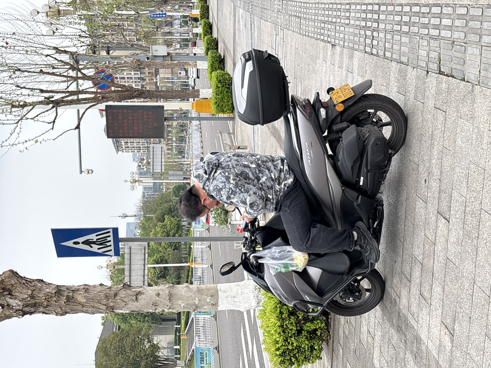 This image, captured in Jiangjin, China, presents an urban street scene under an overcast sky. In the foreground, an adult male sits astride a dark grey scooter parked on a light grey tiled sidewalk. He wears a grey and black patterned hooded sweatshirt, dark jeans, and black athletic shoes. The male is observed from the right side, actively looking down at and manipulating a smartphone held in both hands. A transparent plastic bag containing light-colored contents hangs from the scooter's handlebars, and a black storage box is mounted on its rear rack. The scooter's yellow license plate displays the characters "A 003PD". Adjacent to the scooter is a row of low green bushes, and a tactile paving strip with raised rectangular blocks runs along the sidewalk edge. Beyond the sidewalk, an asphalt road features white lane markings and a white metal barrier. In the midground, a tall tree with bare bark and a white-painted base stands next to a blue rectangular pedestrian crossing sign. Further down the street, an electronic LED display board exhibits red Chinese characters, and streetlights are visible. A surveillance camera is mounted on a pole above the LED sign. The background consists of modern multi-story buildings, typical of an urban environment.