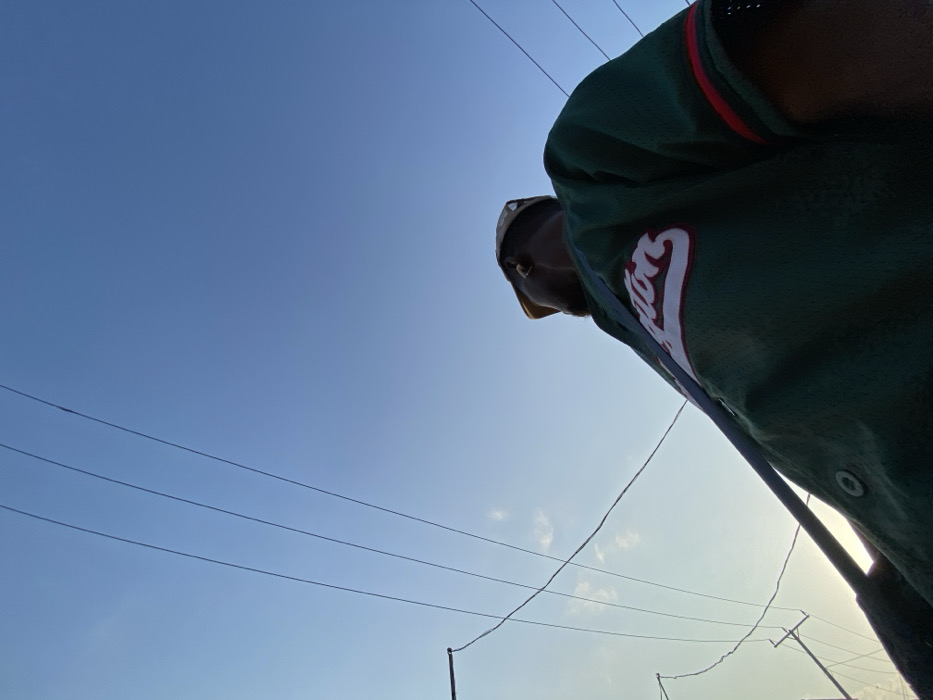 A low-angle shot features a person wearing a green baseball jersey with white lettering and red trim. They are also wearing a light-colored baseball cap. The sky is visible in the background, a clear blue gradient fading to a lighter hue near the horizon. Power lines crisscross the sky, and a few distant streetlights are visible along the horizon. The sun is obscured but casts a bright glow from the lower right corner.