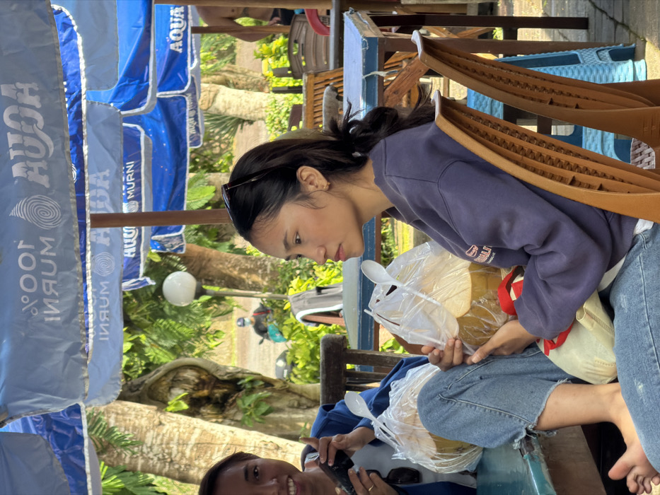 A young woman in a purple sweatshirt and jeans sits outdoors, holding a plastic bag filled with coconuts