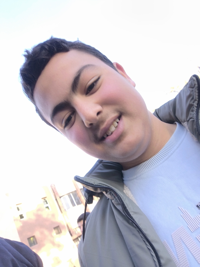 This image is a low-angle, selfie-style photograph taken outdoors in Jirud, Syria, under bright daylight