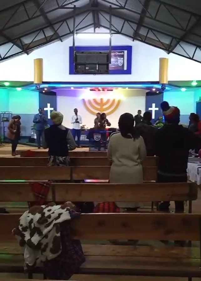 A church congregation is standing and singing during a service. The church has wooden pews and a stage with a cross and a menorah. There are approximately a dozen people in the video. Some people are standing and facing the stage, while others are sitting in the pews.