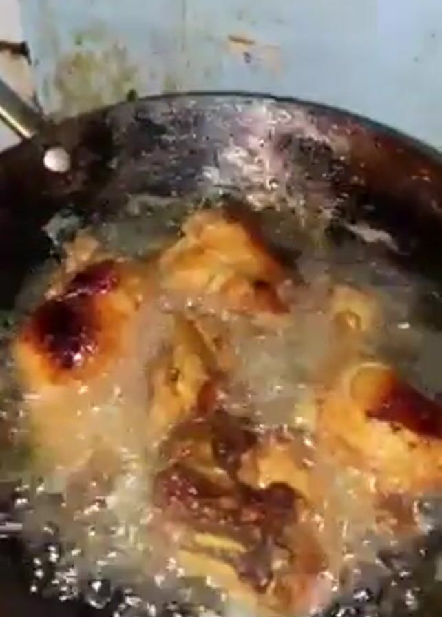 pieces of chicken being fried in oil in a black pan. The pan is on a stove against a white tiled wall. A woman in a blue shirt appears in the video, smiling and making a peace sign with her hand. The background behind her is a cluttered storage area.