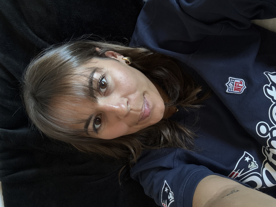 A female individual is depicted in a medium shot, looking directly into the camera. She has brown hair with bangs and brown eyes. Her lips are slightly puckered in a subtle expression. She wears a dark blue long-sleeved shirt or sweatshirt. The shirt features the New England Patriots logo on the upper left arm/shoulder and the word "Patriots" in white lettering across the chest. An NFL shield logo is visible on the right sleeve. A small gold-colored hoop earring is present in her right ear, and a thin gold-colored necklace is visible. A faint, indistinct tattoo is partially visible on her inner left forearm. The background is a uniform dark, textured black fabric, suggesting an indoor setting. The specific location in the city of Cannes, France, cannot be determined from the visual content of the image.