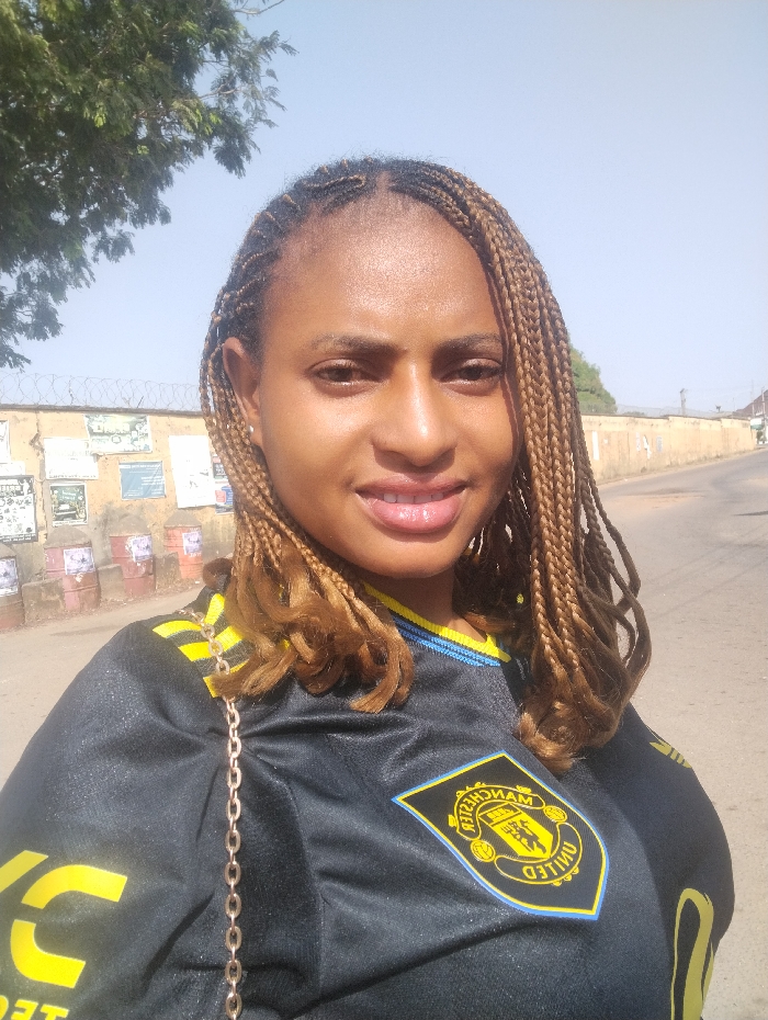 This image captures a daytime outdoor scene in Narayi, Nigeria. The central subject is a young adult female, positioned in a front-facing portrait. She has dark skin, dark eyes, and a slight smile, looking directly at the camera. Her hair is styled in numerous small, light-brown braids, some of which fall forward over her shoulders. She wears a black short-sleeved athletic shirt featuring a prominent yellow and black Manchester United football club emblem on the chest. A gold-colored metallic chain, likely from a bag strap, is visible over her right shoulder. The background to her left consists of a light-colored wall, topped with a continuous line of razor wire. Multiple weathered, rectangular posters or advertisements are affixed to this wall. Beneath these posters, several reddish-brown cylindrical barrels are visible at the base of the wall. To her right, a paved road recedes into the distance, bordered by another light-colored building or wall further back. The upper left portion of the frame shows green tree foliage against a clear, bright blue sky. The scene is illuminated by natural sunlight.