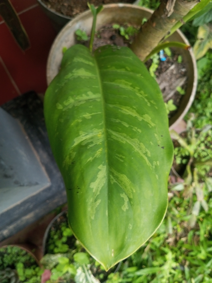 - "A high-angle, close-up photograph captures a large, ovate green leaf, likely from a Dieffenbachia plant, prominently positioned in the foreground" by FM-65nep1, licensed under CC BY 4.0
