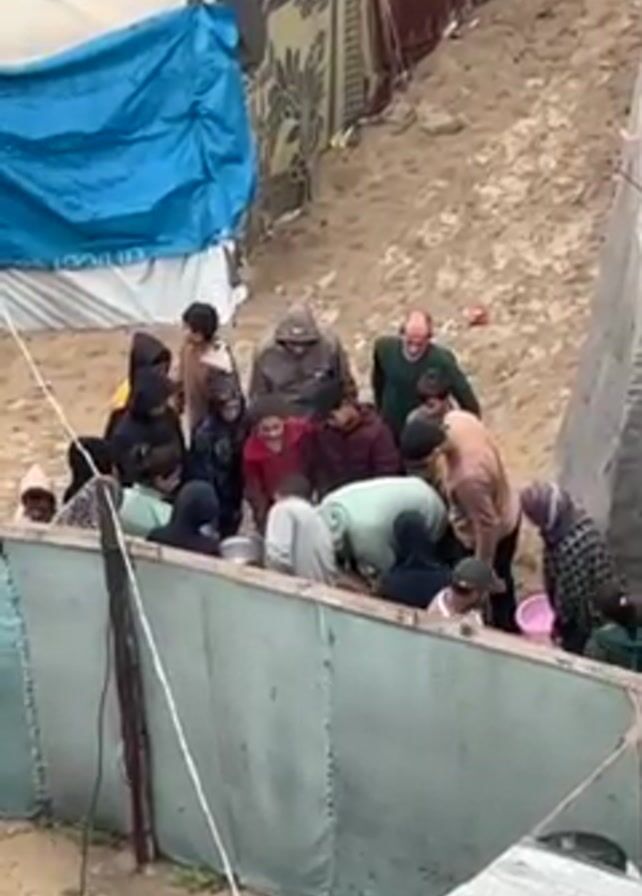 A group of roughly 15 people of varying ages, including children, are gathered around a trough-like structure with light green walls. They appear to be accessing something inside, possibly water. Some are bent over, reaching into the trough with containers. The setting appears to be a camp, possibly for displaced persons, indicated by tents and tarpaulins visible in the background. One tent has "UAE AID" printed on it and another has "UNICEF". The ground is sandy. The overall tone is one of scarcity and need, suggesting the people are obtaining a vital resource.