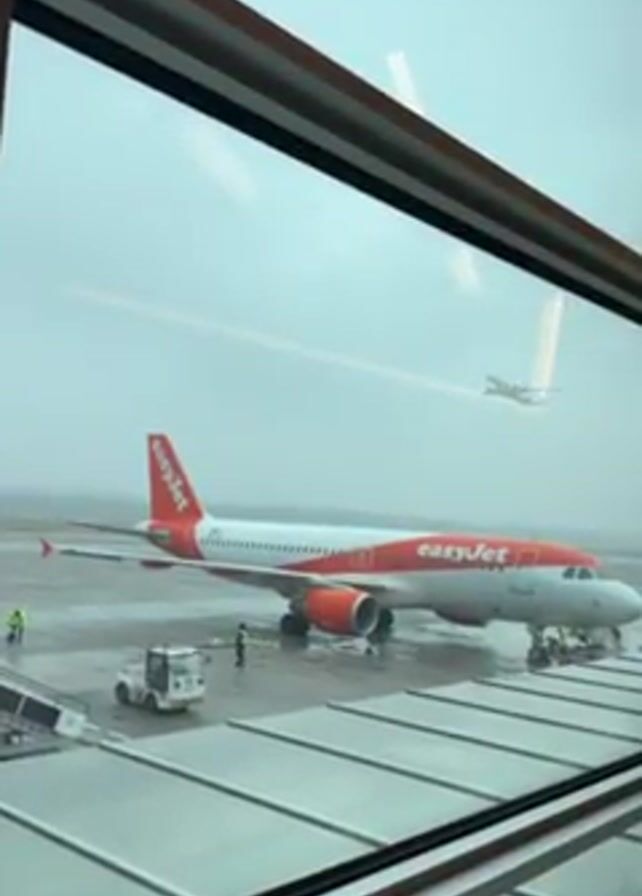 n EasyJet airplane at an airport viewed from inside a terminal window. The plane is painted with EasyJet's distinctive orange and white color scheme. A small utility vehicle sits next to the plane along with a set of stairs. Two ground personnel stand near the airplane, while a third works on the plane. In the sky, partially obscured by the mist, another, larger plane takes off. The weather is foggy and gray.