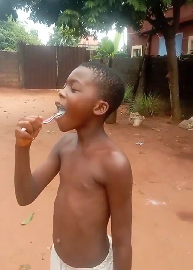 A shirtless, dark-skinned boy with a short haircut is brushing his teeth outdoors, standing on a red dirt surface