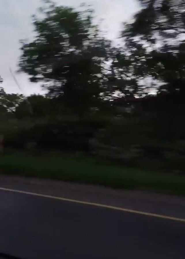 view from inside a moving vehicle, likely a car, looking out the side window. The road is asphalt with a yellow dividing line and a green shoulder. On the far side of the road, there is dense foliage, primarily trees, making it difficult to see beyond. The sky is overcast and it appears to be early morning or late evening due to the subdued lighting. The focus is blurry due to the motion of the vehicle. An occasional red blur appears in the periphery, likely from passing tail lights.