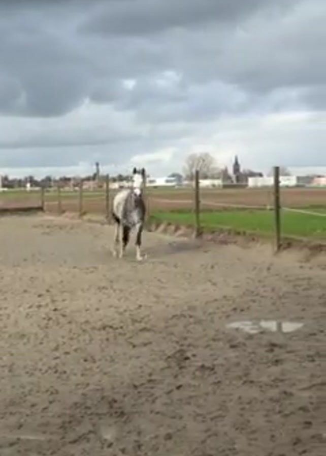 gray-and-white horse trotting and stopping in a sandy paddock. The horse is wearing a bridle. The paddock is surrounded by a fence. In the background, there is a field, some trees, and buildings. The sky is cloudy and overcast.