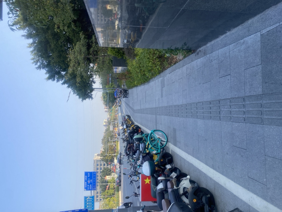 A sidewalk is lined with parked motorcycles and bicycles, many grouped closely together. A Chinese flag is visible amongst the vehicles. The sidewalk is paved with gray stone tiles and features a textured strip for accessibility. Beyond the parked vehicles is a street with distant buildings and clear sky. Greenery, including trees and bushes, borders the sidewalk, contributing to an urban landscape. A tall, dark-colored building is partially visible at the top edge.