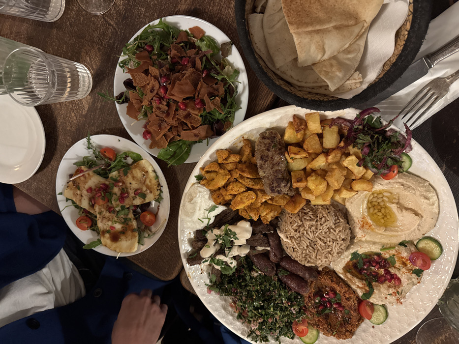 The scene depicts a well-lit restaurant table in Paris, France, laden with a variety of Middle Eastern dishes