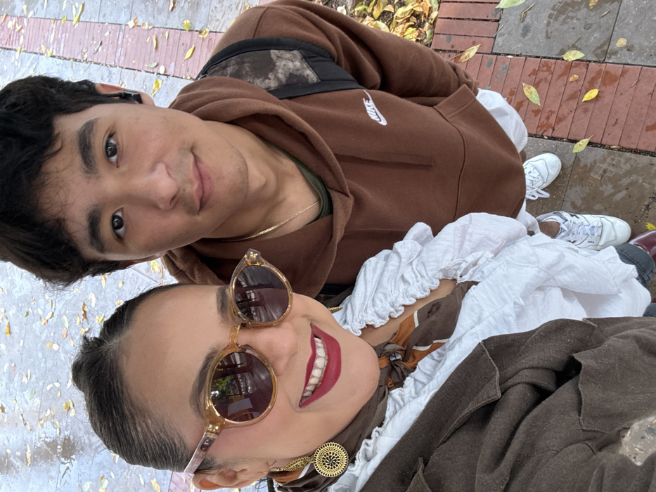 - "An eye-level selfie-style image captures two individuals, an adult female and a young adult male, standing on a wet paved surface with scattered autumn leaves in Burjassot, Spain" by FM-Z4b3e2, licensed under CC BY 4.0