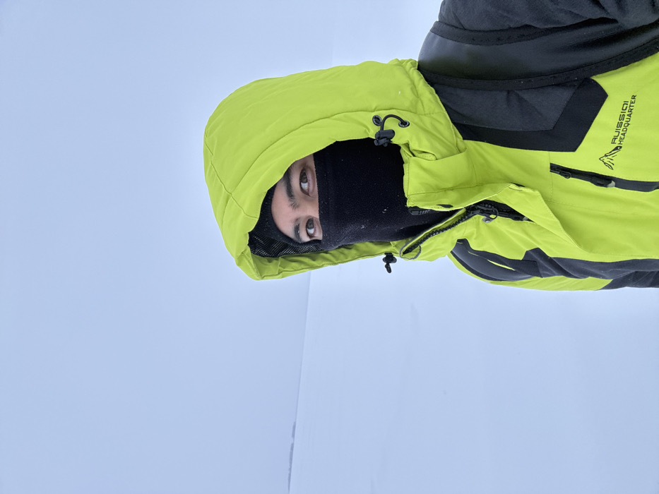 A single individual is depicted in an outdoor winter setting in Bolgar, Russia. The person, positioned slightly right of center, wears a bright lime green and black winter jacket with the hood raised. A black balaclava covers the lower face, leaving only the eyes visible. A black beanie is discernible under the hood. A black backpack strap is visible over the subject's right shoulder. The jacket displays a "RUISSICI HEADQUARTER" logo. The background consists of a vast, unbroken expanse of white snow covering the ground, which blends into an overcast, light grey sky, creating a whiteout condition. A faint, dark horizontal line, indicative of a distant treeline or structures, is visible on the far left horizon. The subject is stationary, looking directly at the camera.