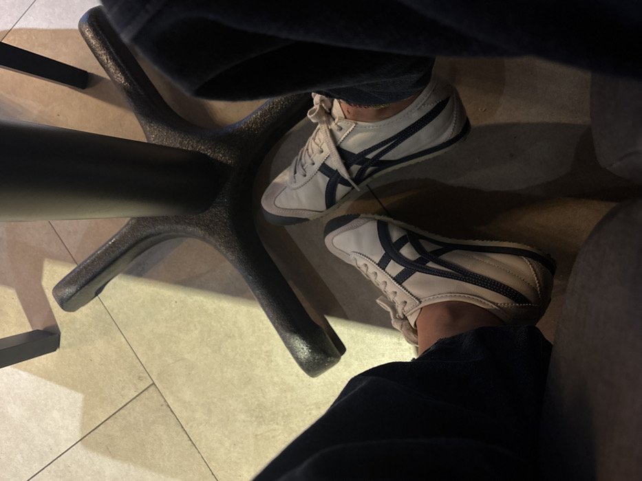 A person sits at a table, feet clad in white sneakers with dark blue stripes. The table has a black, four-legged base. The floor is tiled. The person wears dark blue jeans or pants. The lighting is subdued, casting shadows around the table and sneakers. The image is taken from a high-angle perspective.