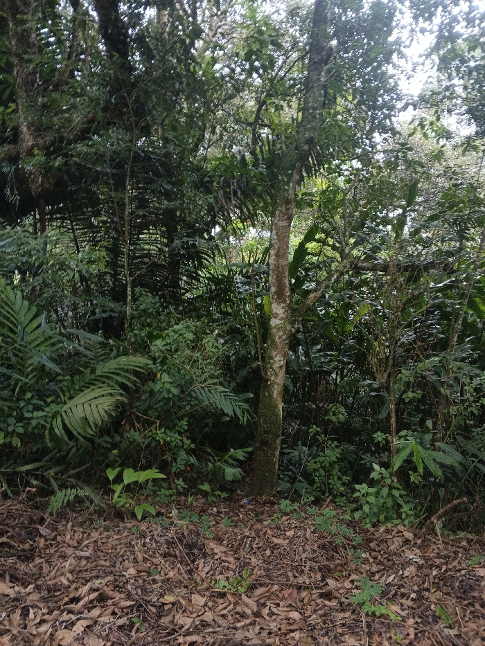 The scene depicts a natural, densely vegetated environment located in Lalitpur, Nepal. The foreground consists of a thick layer of dry, brown fallen leaves interspersed with sparse green sprouts. Above this, the area is dominated by an extensive array of green foliage, including various broad-leaf trees, large-fronded ferns, and dense undergrowth. Multiple tree trunks are visible throughout the frame; a prominent, lighter-barked trunk with visible moss growth stands slightly right of the vertical center. Another tree with a darker, thicker trunk is visible on the far left. No individuals or animals are present. A small, light-colored piece of discarded material is discernible on the leaf-covered ground, positioned left of the prominent tree's base. The lighting appears diffuse, consistent with an overcast sky or dense overhead tree canopy.