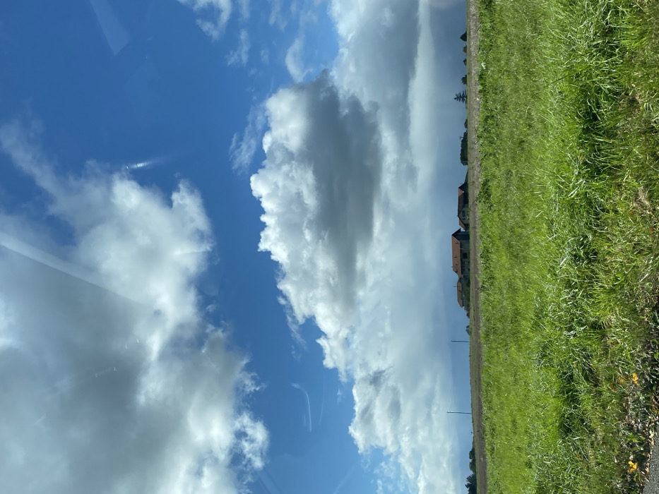 The image presents a rural landscape in Anières, Switzerland, observed under a partially cloudy sky. Approximately two-thirds of the frame is occupied by a bright blue sky with numerous large, white cumulus clouds. Towards the distant horizon, a darker, more uniform cloud mass suggests localized overcast conditions. The immediate foreground features a dense field of vibrant green grass. Beyond this, a flatter expanse of lighter green and brownish vegetation extends to the mid-ground. On the distant horizon, a cluster of at least four buildings with reddish-brown tiled roofs is visible, consistent with farmhouses or agricultural structures. Several thin, vertical utility poles are present in the mid-ground, and a solitary conifer tree stands to the right of the building cluster. Diagonal light reflections and streaks are evident across the upper portion of the image, indicating it was captured through a glass pane. No individuals or active subjects are depicted within the scene.