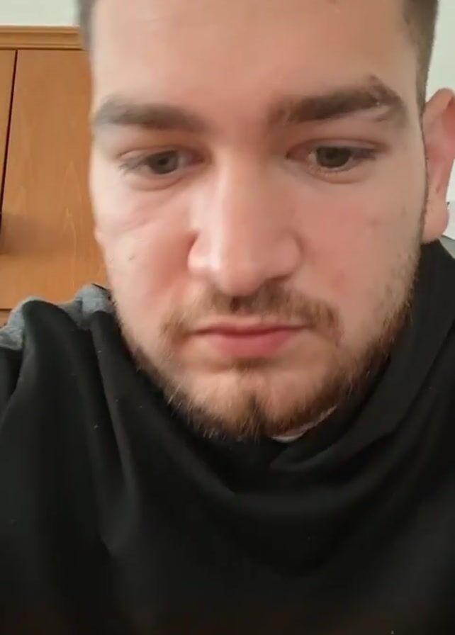 A close-up shot shows a man with a beard and light eyes looking down at the camera. He is wearing a black hoodie. The background is out of focus and appears to be a plain white wall.