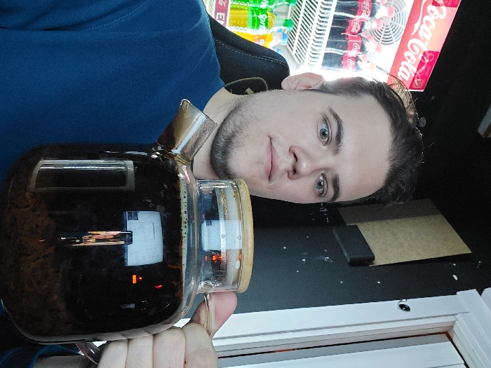 A male subject, appearing to be in his 20s to early 30s with dark hair, light eyes, and light stubble, is depicted in a medium close-up, facing the camera with a neutral expression. He is wearing a dark blue long-sleeved shirt and is seated in a black chair, partially visible. The subject is holding a large, clear glass teapot containing a dark brown liquid with visible tea leaves or particulate matter. The teapot features a light-colored, possibly bamboo, lid with a clear central insert. Reflections consistent with a digital display and orange indicator lights are visible on the teapot's surface. The background to the left of the subject features a commercial refrigeration unit displaying multiple red-labeled Coca-Cola products on the top shelf and green-bottled beverages (likely Sprite) on a lower shelf. A "Coca-Cola" logo is visible on the unit's branding panel. To the right of the subject, a dark-colored wall is present, onto which two light-colored, rectangular panels are mounted. White specks are scattered across the dark wall. A white door frame or trim is visible on the far right edge, and a small, dark circular object, potentially a camera or sensor, is mounted on the wall near the frame. The scene is illuminated by artificial light. This event occurs indoors in the city of Tashkent, Uzbekistan.