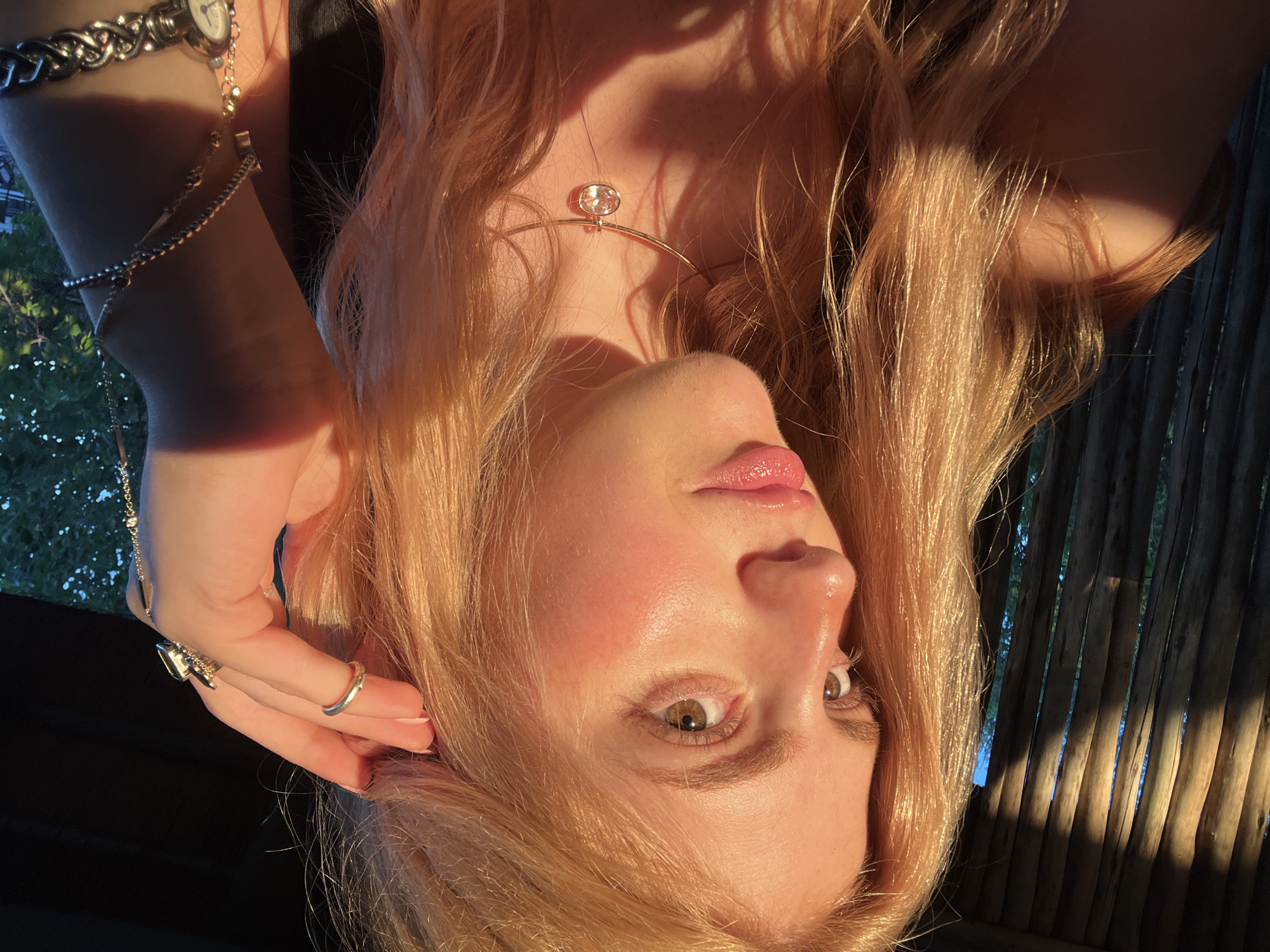 A close-up, upside-down portrait of a woman with light blonde hair, hazel eyes, and fair skin, bathed in warm light